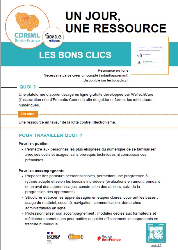 Cette fiche descriptive présente « Les bons clics », un outil qui contribue à la lutte contre l’illectronisme.