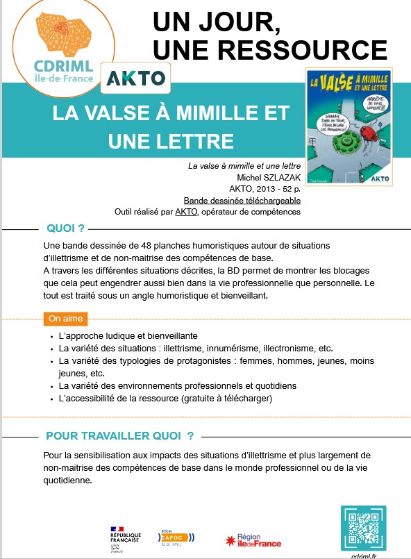 Les fiches descriptives « 1 jour 1 ressource » sont destinées aux professionnels et bénévoles de l’accompagnement d’adultes en situation d’illettrisme.