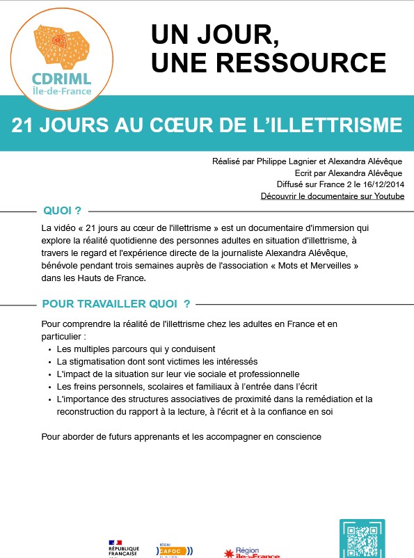 Cette fiche descriptive présente la vidéo documentaire : « 21 jours au cœur de l’illettrisme ».